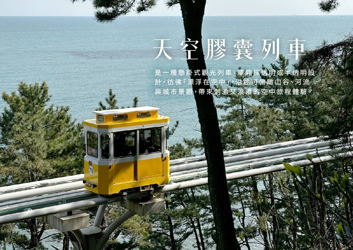 【天空膠囊列車(四人一台)】海雲台是釜山著名景點之一,現在更不能錯過這處新建景點「海雲台藍線公園觀光列車」,其中「天空膠囊列車」更夯翻各大平台,由舊鐵道改建而成,以海雲台尾浦為起點,中途停靠青沙浦區段,7~10公尺寬的空中軌道運行,車廂至多可乘載4名成人,沿著海岸線行走2公里,搭乘時間約30分鐘,能在小巧繽紛的車廂中,窺探東釜山的山海之美,在這裡待上一整天舒適無匱。