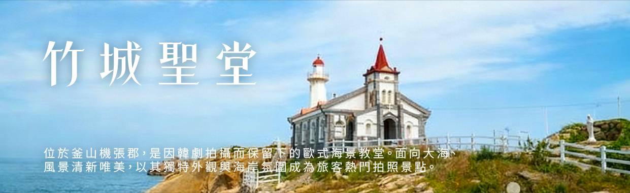 【竹城聖堂】是位於小漁村的地理特性,使其形成了與眾不同的氛圍,彷彿將中世紀某座海濱村莊原封不動搬來,整座聖堂與周邊風景如畫一般美麗。打在岩石上的白色碎浪與聖堂的紅色屋頂形成鮮明對比,一下子便吸引了訪客們的目光。竹城聖堂中最多人排隊等候之處,便是如同架好相框般的拍照區,相框中的藍色大海和天空形成了絕美的背景。