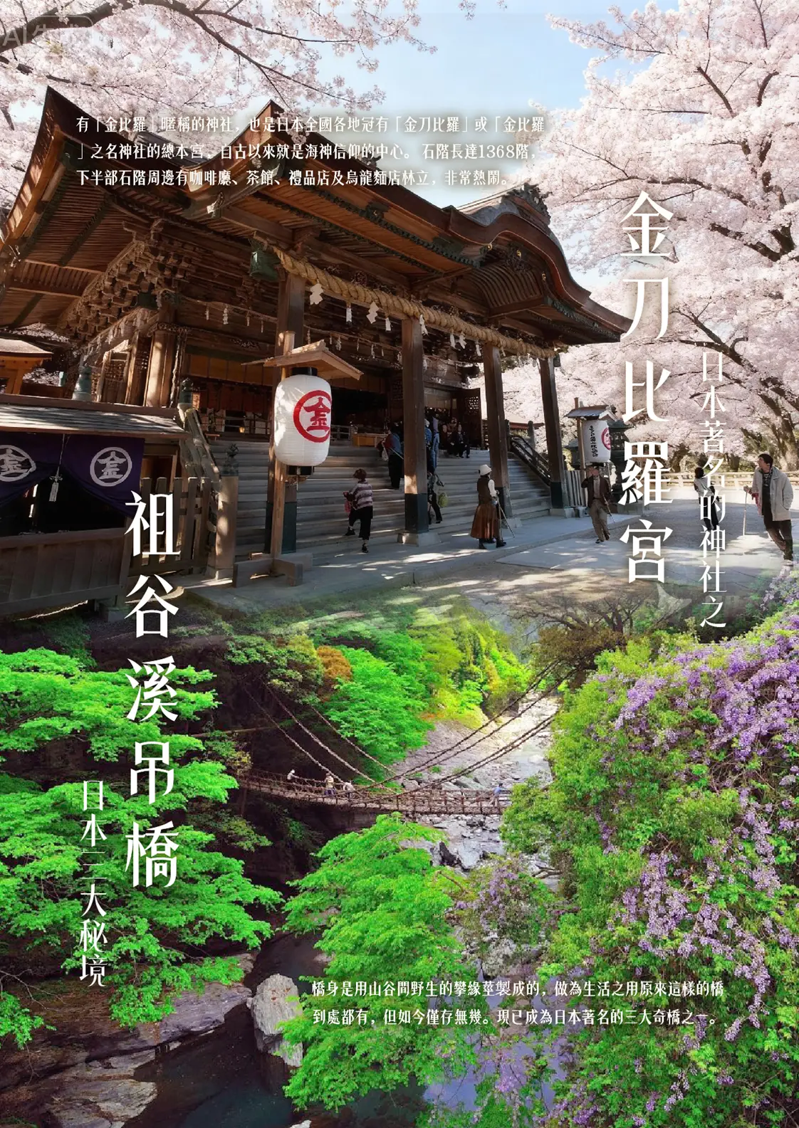 【日本人一生必經參拜之道~金刀比羅宮】日本全國信仰深厚的神宮,鎮守於琴平山東側山腹,參拜伊勢神宮與參拜金刀比羅宮,同為庶民百姓畢生所期。欲登上金刀比羅宮則先需爬上365個石階才能到達神社大門,而從神社大門需再行走785 階才能到達本宮,金刀比羅宮的本宮內供奉著「大物主神」及「祟德天皇」。大物主神主宰航海、農業、漁業、交通、醫藥、殖產等,各方面在交通極不方便的古代,無數平民千里迢迢翻山越嶺只為一圓畢生的願望。