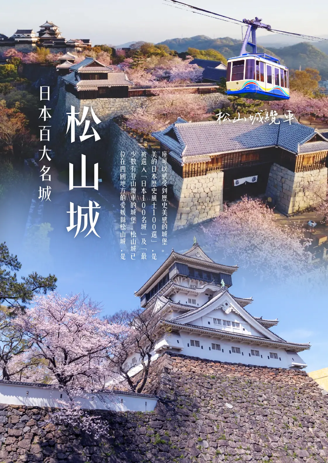 【松山城+纜車(不上天守閣)】松山城蓋在海拔 132 公尺的勝山上。山頂上建有本丸,山麓原野則有成為史蹟庭園的二之丸,以及作為堀之內公園備受喜愛的三之丸。在關原之戰活躍的加藤嘉明為初代藩主,他自慶長 7 年 (1602 年) 起花費長達四分之一世紀建城,使其成為「現存十二天守」之一,城內擁有 21 棟重要文化財。松山城的天守聳立於松山市中心地帶的山上。從城堡望出去的景色美不勝收,海拔 161 公尺的天守頂樓可欣賞到精彩全景,不容錯過。往西可欣賞瀨戶內海,往南可遠眺石鎚山系。
