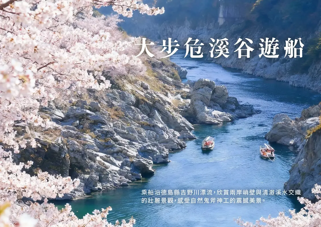 【大步危峽谷遊船】「大步危小步危」吉野川激流歷經 2 億年橫貫四國山地沖蝕而成的大峽谷,延綿約 8 公里,岩石峭壁宛如大理石雕刻一般,美不勝收。您能在船上一邊聽著資深船夫講解,一邊近距離欣賞大步危峽谷的美麗景色。