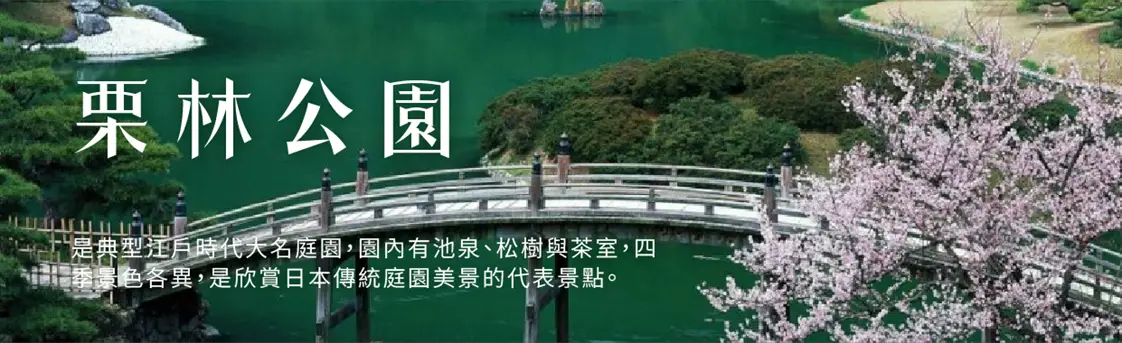 【栗林公園】是作為名勝庭園中腹地最廣的。擁有 400 多年歷史,保有傳統的江戶式池泉迴游庭園,漫步園中時,景色會隨著每踏出的一步而有所改變,因此號稱「一步一景」。於 1625 年由當時讚岐藩(香川縣舊名)藩主苦心經營,歷經百年打磨潤飾而完成的傳統庭園,是江戶時代最著名的「迴遊式大名庭」,而這屬於江戶時代的庭園雖經過二次大戰仍完整地保留下來,現在更被指定為日本國家的特殊名勝。