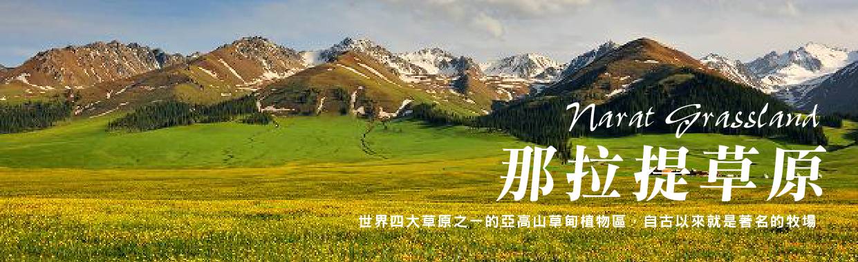 【那拉提草原】是世界四大草原之一的亞高山草甸植物區,自古以來就是著名的牧場。河谷、山峰、深峽、森林交相輝映。這裏生長著茂盛的細莖鳶尾群系山地草甸。6—9月,各種野花開遍山崗,紅、黃、藍、紫五顏六色,將草原點綴得絢麗多姿。每年6月以後,大群的牧畜轉入,進入草原的黃金季節,草原人的各種集會也多在此舉行。