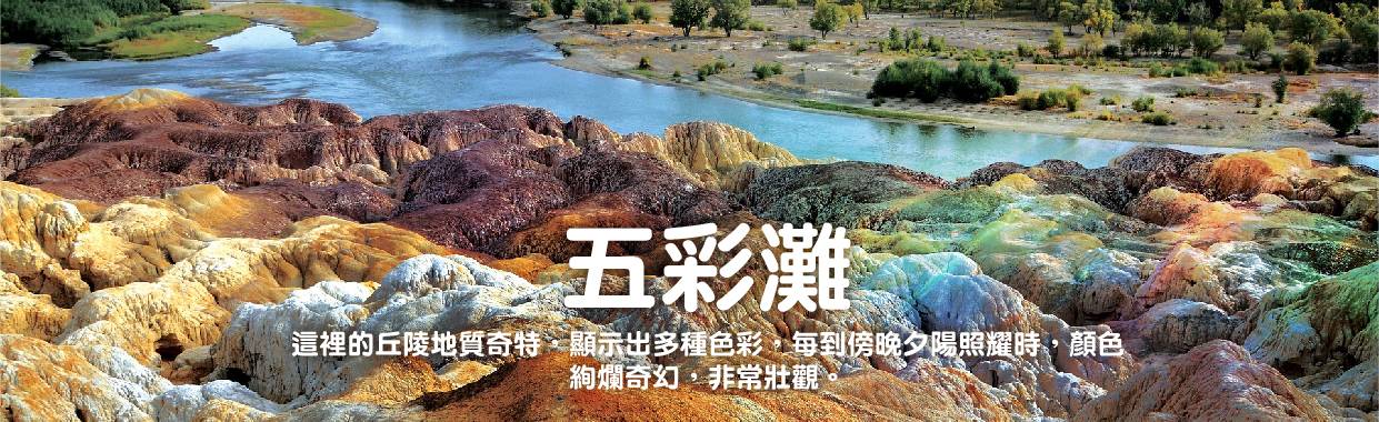 【五彩灘】五彩灘是懸崖式的雅丹地貌,山勢起伏、顏色多變,其是由激猛的流河侵蝕切割以及狂風侵蝕作用而共同形成。由於河岸岩層間抗風化能力的強弱程度不一而形成了參差不齊的輪廓,這裡的岩石顏色多變,且在落日時分的陽光照射下,岩石的色彩以紅色為主,間以綠、黃、白、黑及過渡色彩,色彩斑斕、嬌豔嫵媚,因此被稱作“五彩灘”並號稱是“新疆最美的雅丹地貌”。