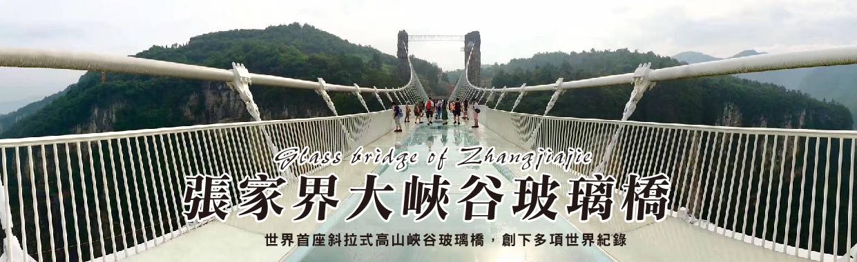 【玻璃橋】 張家界大峽谷的玻璃橋是世界最高、跨度最長的玻璃橋,建在大峽谷兩側的峰頂上。橋 拱距谷底相對高度約 400 米,全長約 370 米,橋面全部採用透明玻璃鋪設,橋中心有全球最高的蹦 極。站在橋上,腳下谷底全景盡收眼底 。