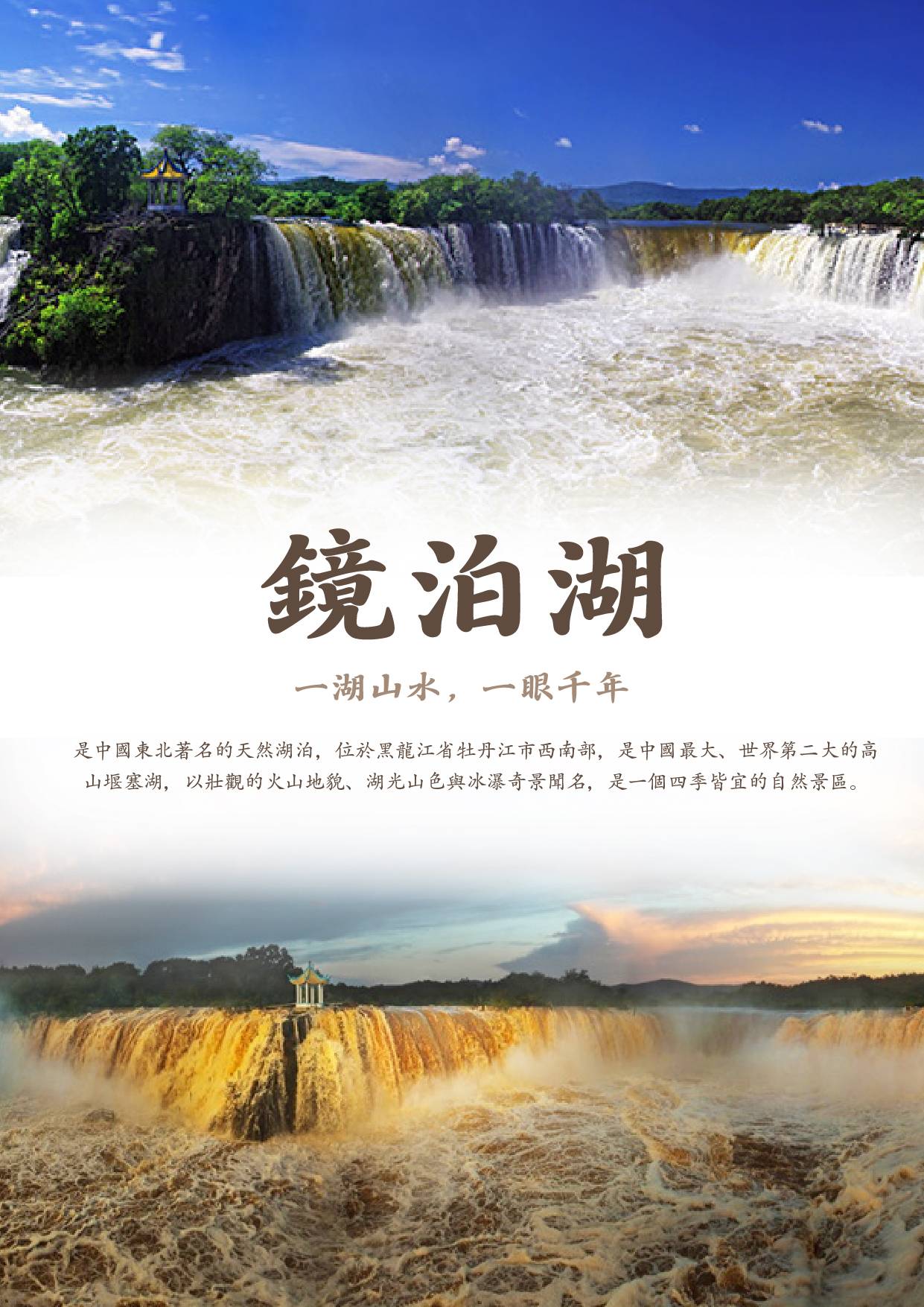 【鏡泊湖風景區】鏡泊湖風景秀麗,氣候宜人,是有名的旅遊勝地,其著名的景觀有吊水樓瀑布,道士山,白石砬子,老鷹砬子,珍珠門,大孤山,小孤山等,號稱「鏡泊八景」。鏡泊湖是歷經五次火山爆發,由熔岩阻塞河流形成的高山堰塞湖,是世界上少有的高山湖泊。以天然無飾的獨特風姿和峻奇神秘的景觀而聞名於世,是中國著名風景區和避暑勝地。