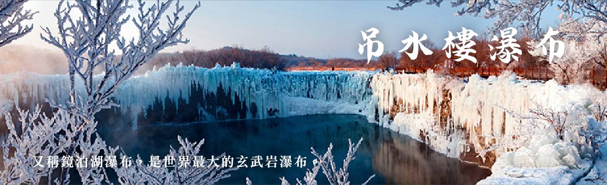 【吊水樓瀑布】是鏡泊湖水瀉入牡丹江的出口,只有身臨此處,才知道當地稱為吊水樓,真是恰如分。此處有一道大壩,水從壩上往下沖,形成一個落差約20公尺,寬約40公尺的瀑布。瀑布下其的石塊受到沖擊,年深日久,淘挖磨蝕成圓柱形的深潭,深達數十公尺,周圍還有涼亭和鐵鏈圍欄,供遊人站在瀑布上面岸邊觀瀑。瀑布每天都有跳水表演,從瀑布上的懸崖一躍而下,63歲的狄煥然,跳水跳了三十幾年,2008年還榮登最高瀑布跳水金氏世界紀錄。跳瀑布飛人狄煥然:「冬天這裡水不凍,而且水溫在零上八度,而且實際上要想找一個,能春夏秋冬都能跳水的地方,那就是鏡泊湖。」