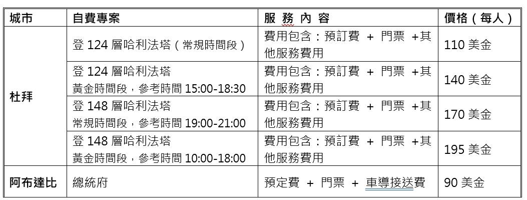 ◆ 進出飯店行李服務費:杜拜帆船飯店每件美金5元/阿布達比酋長皇宮飯店每件美金3-5元/其他飯店則同一般旅館每件美金1元。