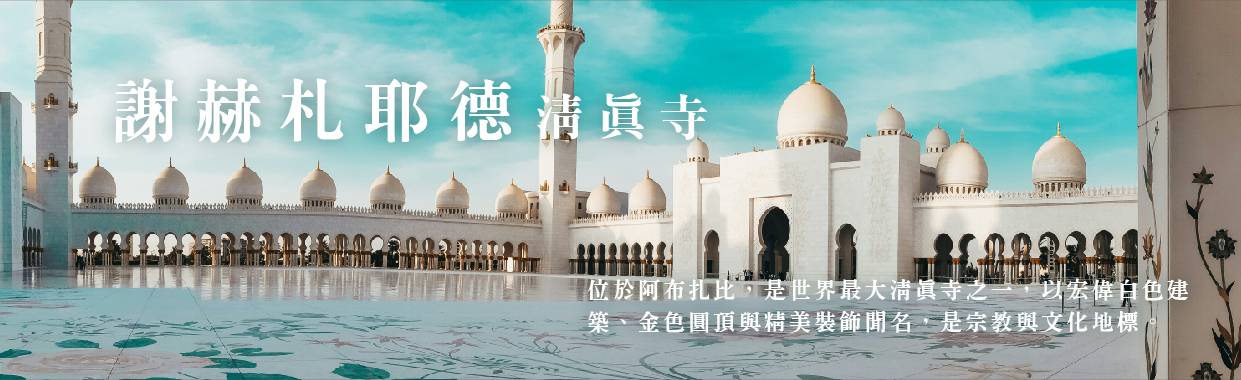【謝赫札耶德清真寺】(入內參觀)又稱阿布達比大清真寺。單看外表已知所費不菲,純白建築宏偉不凡,足夠容納四萬名信眾一同聚會。廣闊中庭廣場地上,已見鋪滿馬賽克的花卉圖案,走進殿內,又有花紋精細的義大利雲石牆壁,由天花垂下的七盞巨型吊燈,更鑲滿施華洛世奇水晶,稱得上光芒耀目。
