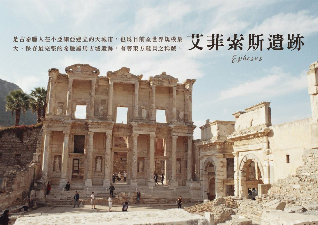 以弗所是土耳其最壯觀的古羅馬遺城之一,以宏偉的石造大道、劇場與神殿構築出古代城市的輝煌。作為昔日小亞細亞最重要的港口與商業中心,這裡曾是羅馬帝國文化、商業與信仰的交會點,繁華程度堪比古羅馬本城。漫步在大理石大道上,眼前依序展開的是 塞爾瑟斯圖書館(Library of Celsus) 的精緻立面、可容納兩萬人的 大劇場(Great Theatre) 以及古市集、浴場與神殿群落。每一塊斷壁殘柱,都是古文明故事的延續;每一道光影,都彷彿讓人走回帝國興盛的年代。以弗所也是《新約聖經》中多次提及的重要城市,聖母瑪利亞曾被傳說居住於附近山丘,基督宗教的足跡及文化痕跡至今依然可見。這裡擁有世界最完整的古羅馬城市格局,被視為「活著的戶外博物館」。
