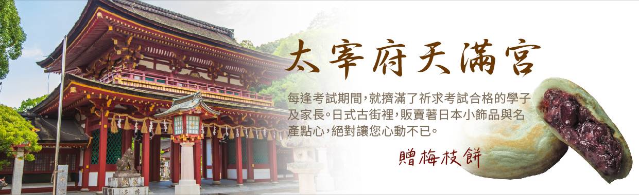 【太宰府天滿宮】是全國天滿宮本社,每逢考試期間,就擠滿了祈求考試合格的學子及家長;由於菅原道真愛梅,天滿宮園中遍植梅樹而有「飛梅傳說」之稱,梅餅、梅茶等更是當地著名特產。附近販賣的現烤的「梅餅」更是美味。還有永保終身的「飛梅御守」更是一絕。太宰府前的日式古街裡,販賣著各式各樣的日本小飾品與名產點心,絕對讓您心動不已。
