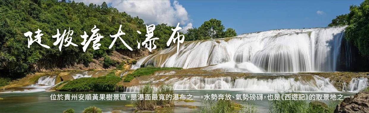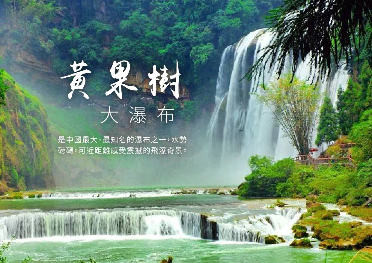 【黃果樹瀑布景區】位於中國貴州省安順市鎮寧布依族苗族自治縣,是珠江水系打邦河的支流白水河 九級瀑布群中規模最大的一級瀑布,古稱白水河瀑布,亦名“黃葛墅”瀑布或“黃桷樹”瀑布,因本地廣泛分佈著“黃葛榕”而得名,是世界著名大瀑布之一。以水勢浩大著稱。瀑布高度為77.8米,其中主瀑高67米;瀑布寬101米,其中主瀑頂寬83.3米。黃果樹瀑布屬喀斯特地貌中的侵蝕裂典型瀑布。景區以黃果樹瀑布為中心, 有地面有18個瀑布,地表下有14個瀑布。黃果樹瀑布是亞洲最大的瀑布。黃果樹瀑布最奇特的地方是在瀑布背後隱藏著一條百公尺長的水濂洞、洞中除了觀賞千奇百怪的鐘乳石、更可置身洞中觀賞瀑布、令您此生難忘。