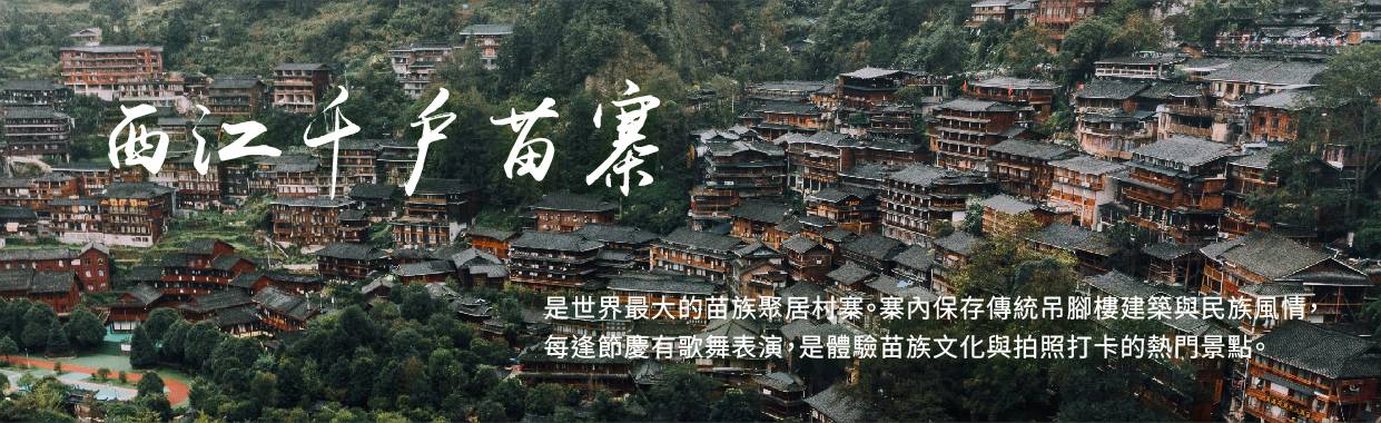 【西江千戶苗寨】是聞名遐邇的世界第一大苗寨,四面環山,重巒迭嶂,梯田依山順勢直連雲天,白 水河穿寨而過將西江苗寨一分為二,全寨共有一千二百八十五戶人家約五千多人而因此得名千戶苗寨,寨內吊腳樓層層迭迭順山勢而建又連綿成片,房前屋後有翠竹點綴,而吊腳樓多為三層,基座以青石、卵石壘砌,一層圈養牲畜二層住人,三層為糧倉,居住層有長廊,圍有木欄並設有長凳,苗家姑娘多在此挑花刺繡,人稱此長廊木凳為《美人靠》。西元2005年中國民族博物館西江千戶苗寨館正式掛牌,這個中國第一個苗族村寨博物館在西江建立,隨後於2006年,西江苗族刺繡、苗族銀飾鍛制技藝、苗族古歌和苗族吊腳樓營造技藝等被列入首批中國國家級非物質文化遺產名錄,更在2007年被列為世界文化遺產預選地,同年被列入中國歷史文化名鎮和獲得中國景觀村落的殊榮,如遇傍晚時分,全寨的燈火齊明這就是白天黑夜都一樣令人讚嘆的~千戶苗寨。