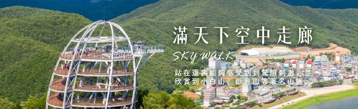 【滿天下空中走廊SKY WALK】擁有萬壑千峰眺望台、滑索和生態公園等設施。萬壑千峰所在的眺望台位於距離南漢江水面120米的高空,站在這裏能夠欣賞到小白山支流以及融匯到南漢江的美妙風景。眺望台外側突出的部分是按照三足鳥進行設計的,這條天空之路使用三層高強度透明鋼化玻璃製成,站在這裏能夠感受到到驚險刺激。漫步在長600余米的螺旋形散步陸上,能夠360度欣賞到小白山、嶽月山等白頭大幹的著名山脈。