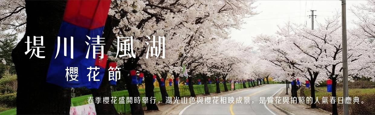 【堤川清風湖櫻花節】雪白櫻花搭配上五顏六色的迎春花和杜鵑花等美麗春花,爭奇鬥艷綻放於清風湖畔的春季慶典。活動現場除各種展覽之外,還包括有別具色彩的高空彈跳冒險、水上休閒運動設施等,在山明水秀的美麗自然風光下,享受清風湖畔櫻花慶典帶來的春意。