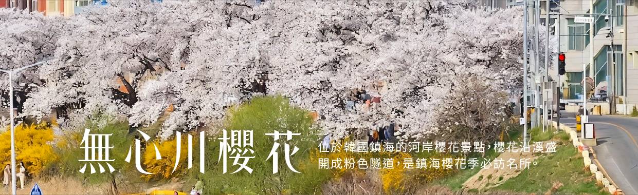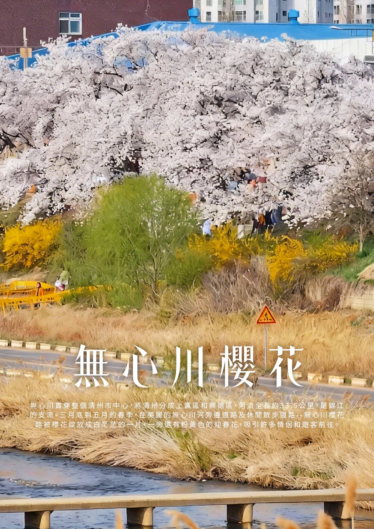 【無心川櫻花】無心川貫穿整個清州市中心,將清州分成上黨區和興德區,河流全長約33.5公里,是錦江的支流。三月底到五月的春季,在美麗的無心川河旁邊道路及休閒散步道路--無心川櫻花路被櫻花綻放成白茫茫的一片,一旁還有粉黃色的迎春花,吸引許多情侶和遊客前往。