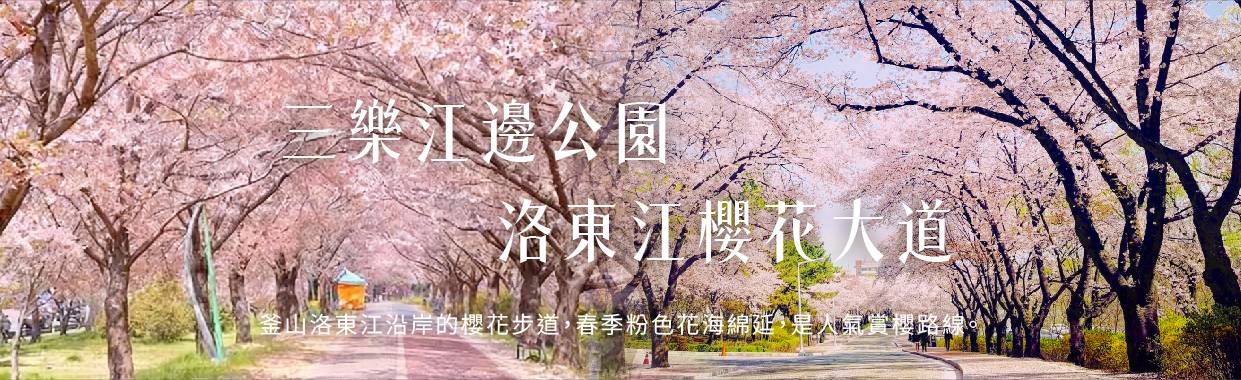 【三樂江邊公園+洛東江櫻花大道(季節性賞櫻)】三樂生態公園狹長的步道邊,每年春天都會開滿櫻花,兩側共1,200棟的櫻花林形成了壯觀的「櫻花隧道」。這裡也曾被選為「韓國最美的100條道路」,是全國知名的賞櫻聖地。全長7公里的公園順著洛東江所修建,在堤防上也有約5公里的散步道路。近來還新種了櫻花、山躑躅等植物,並增設展望台、休息區,讓這裡的環境更加舒適。