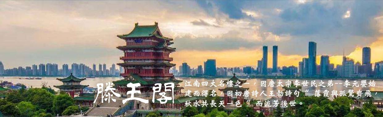 【滕王閣】江南三大名樓之一。歷史上滕王閣先後共重建達29次之多,屢毀屢建。因滕王李元嬰始建而得名,又因初唐詩人王勃詩句落霞與孤鶩齊飛,秋水共長天一色而流芳後世。