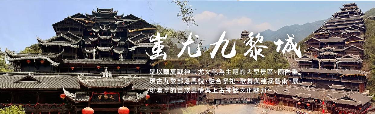 【蚩尤九黎城】中國最大的苗族傳統建築群,由標誌門樓、九道門、九黎宮、九黎部落、北斗七星、苗王府、蚩尤大殿、禹王宮、善堂、盤瓠大殿、百苗長廊、九黎神柱、演武場、百戲樓等40餘處景觀建築構成,是展示、傳承苗族文化的基地。來到蚩尤九黎城,可以觀賞九道門、九黎宮、九黎神柱3項創世界基尼斯紀錄的有名建築。