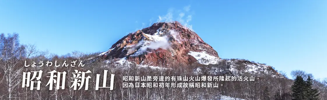 【昭和新山】昭和18年12月28日,周圍發生大地震,一時天旋地轉,造成有珠山東南側火口爆發後,因為頻繁的火山活動一直持續著,在同年11月形成了「溶岩圓頂丘」,直到昭和20年9月20日火山活動停止後,也生成了高407公尺的山,由於是在昭和年間發生,因此稱此山為「昭和新山」。是本世紀最新的火山。