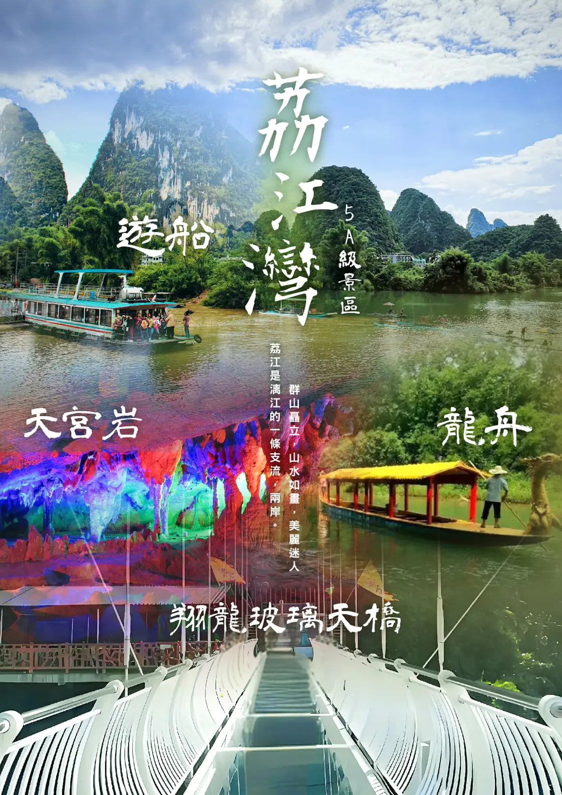 【荔江灣】是一個自然景點,遊客可以在這裡參加各種水上活動,包括龍舟、劍舟等傳統活動。景區內的天宮岩和玻璃棧道等,均為非常受遊客喜愛的攝影勝地。