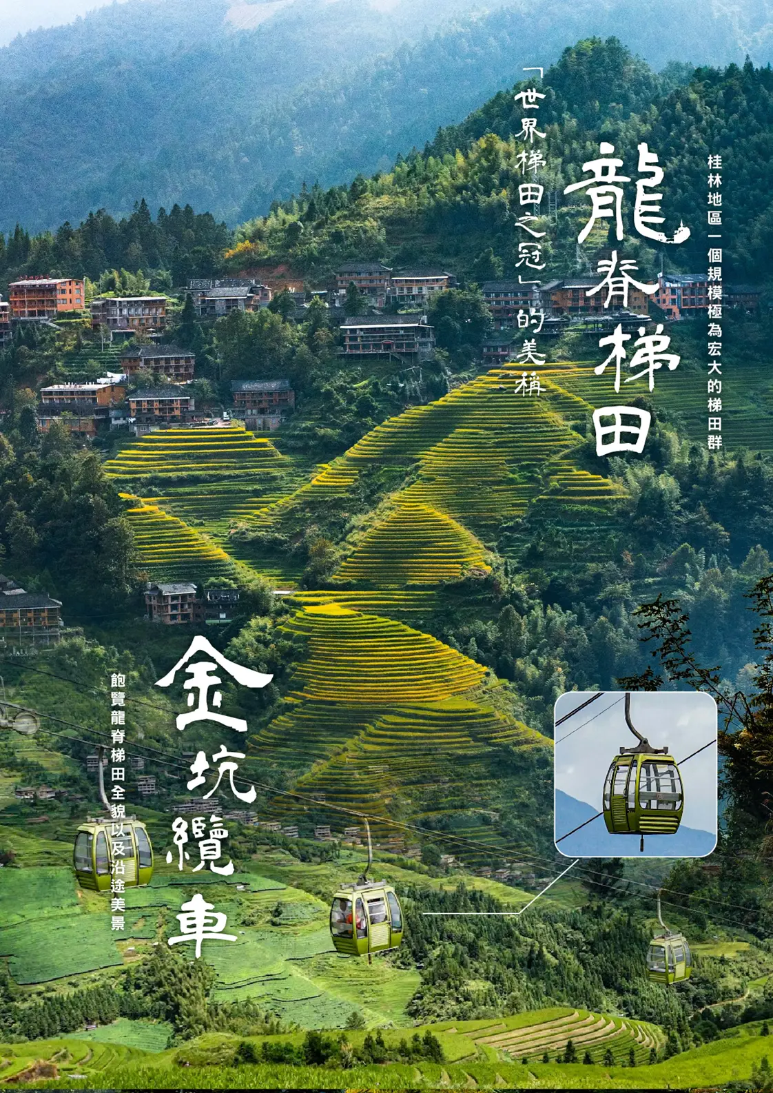【金坑纜車】是遊覽龍脊梯田的重要交通工具之一。纜車起點位於金坑村,沿途俯瞰壯麗的梯田景觀,能夠欣賞到不同角度的山巒與水田。乘坐纜車可輕鬆抵達山頂,從高處欣賞層層疊疊的梯田美景,尤其在日出或日落時,光影變換的景象格外迷人。