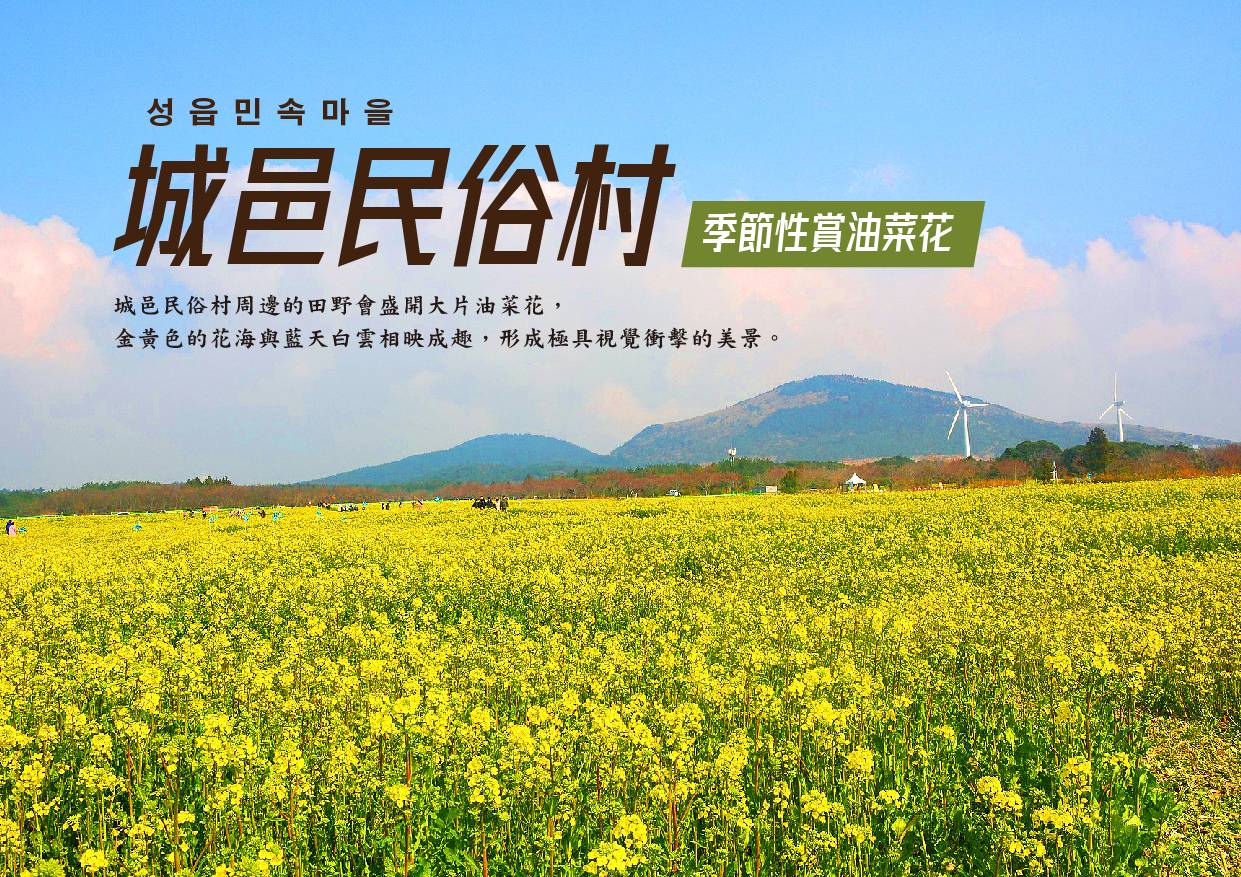 【鹿山路油菜花路】西歸浦加時里村每逢4月,從路口起的10公里路段便會同時綻放油菜花與櫻花,為風光如畫的兜風路線。鮮黃油菜花與粉紅櫻花交織出的景象格外動人,使這條路曾入選「韓國美麗道路100選」。鹿山路是貫穿朝鮮時代頂尖牧馬場的鹿山場與甲馬場的道路,也是目前濟州島首屈一指的油菜花路,已被列為加時里村十景中的第一景。