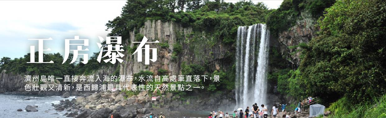 【正房瀑布】位於西歸浦市區東南方約1.5公里處的正房瀑布,與天地淵瀑布、天帝淵瀑布並稱濟州島內三大瀑布。作為瀑布水直接落入大海的東洋唯一海岸瀑布,高23公尺、寬8公尺、深5公尺。