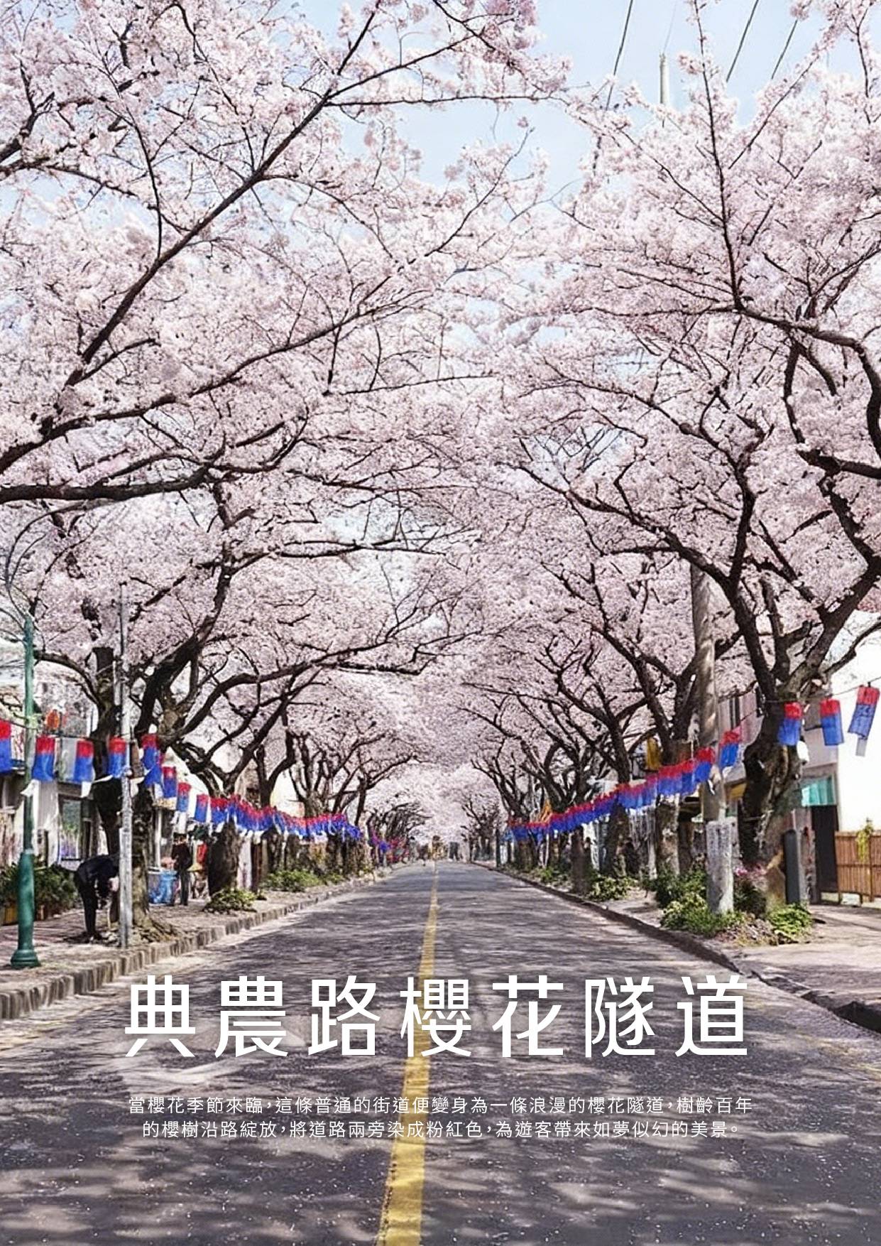 【典農路櫻花隧道(季節性賞櫻)】當櫻花季節來臨,這條普通的街道便變身為一條浪漫的櫻花隧道,樹齡百年的櫻樹沿路綻放,將道路兩旁染成粉紅色,為遊客帶來如夢似幻的美景。