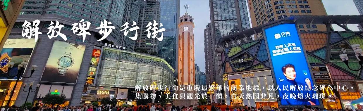 【解放碑步行街】步行街以解放碑為中心,這裡有數量眾多的百貨公司、酒店、飯店等,是重慶購物、美食和走走逛逛的好去處,重慶時尚地標之一。