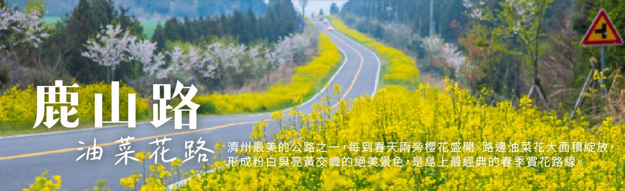 【鹿山路油菜花路】西歸浦加時里村每逢4月,從路口起的10公里路段便會同時綻放油菜花與櫻花,為風光如畫的兜風路線。鮮黃油菜花與粉紅櫻花交織出的景象格外動人,使這條路曾入選「韓國美麗道路100選」。鹿山路是貫穿朝鮮時代頂尖牧馬場的鹿山場與甲馬場的道路,也是目前濟州島首屈一指的油菜花路,已被列為加時里村十景中的第一景。