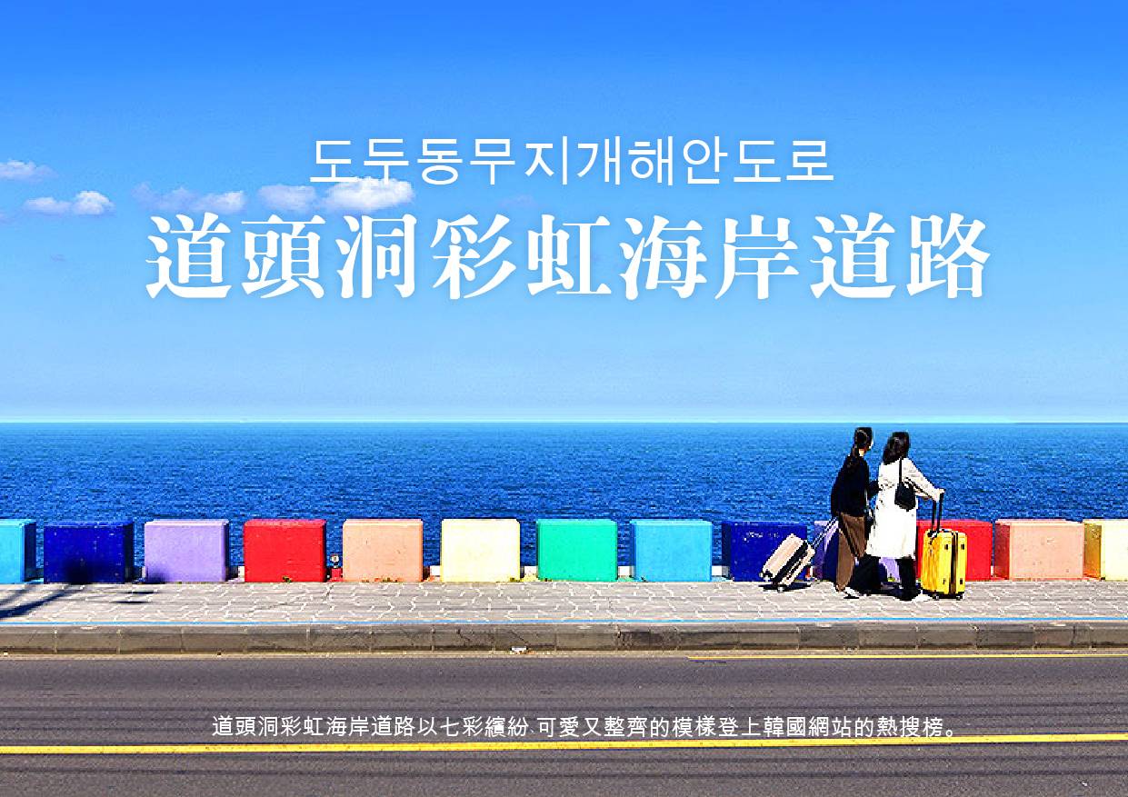 【道頭洞彩虹海岸道路】道頭洞彩虹海岸道路是距機場僅10分鐘車程的特色道路。為了防止車輛墜落,居民們建議為沿海道路旁設置的防護牆上塗色,由於塗上了彩虹色彩,因此被觀光客們稱作道頭洞彩虹海岸道路,也成了著名景點。周圍還有包含海女像在內的各種雕像,也頗有欣賞的樂趣。另外,還可步行前往道頭峰,這裡既是偶來路線,也是私房秘境之一。坡度平緩,可輕易攀登。