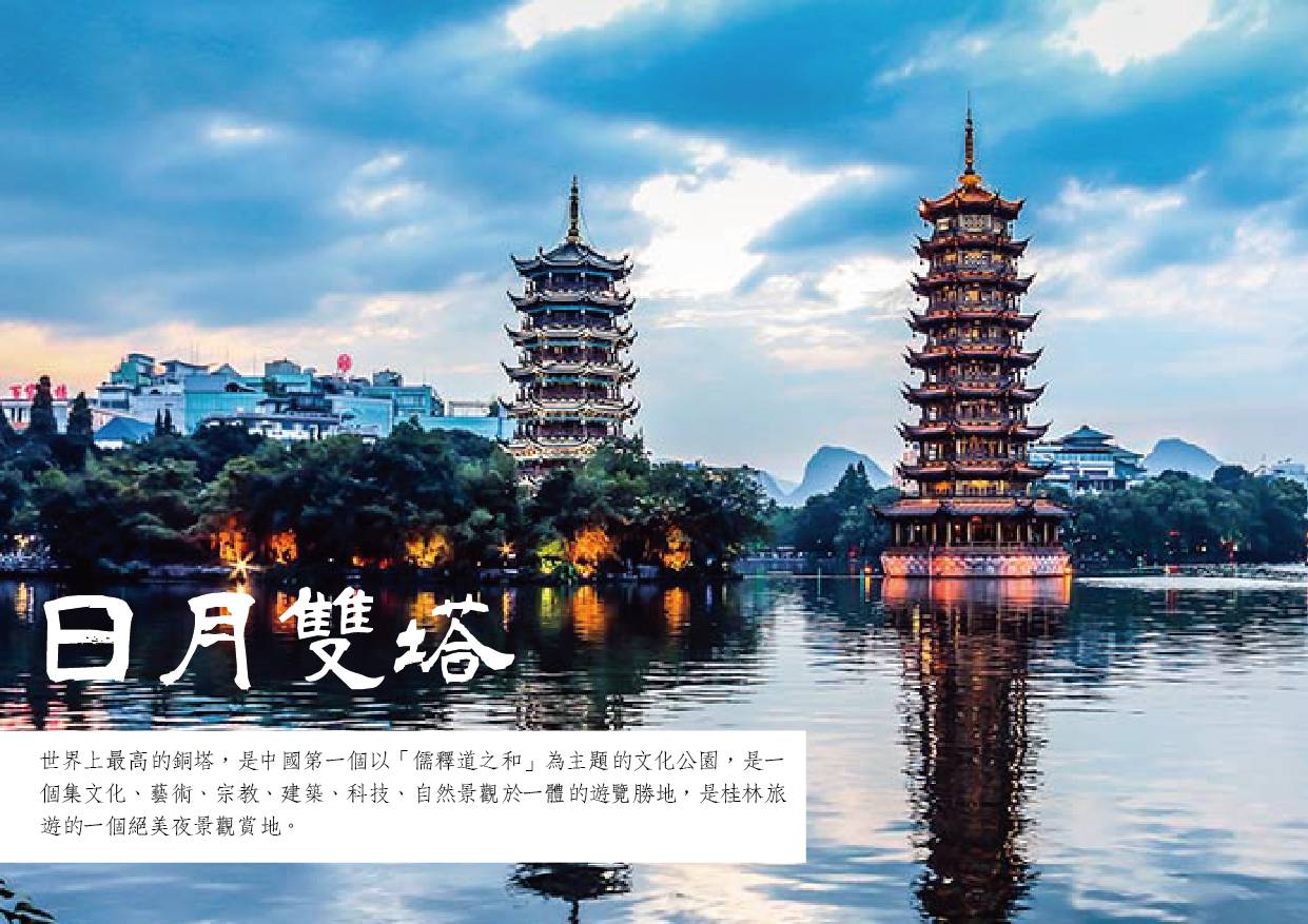 【遠觀日月雙塔】日月雙塔曾焚毀於古代戰火中,後建成於 2002 年,地處桂林市中心區,坐落在桂 林城的中軸線、桂林杉湖島上,與「象山水月」相鄰。象山是桂林的城徽,而雙塔則是新桂林的標識。日塔、月塔與象山上的普賢塔、塔山上的壽佛塔,相互呼應,相互映襯,有「四塔同美」之說。