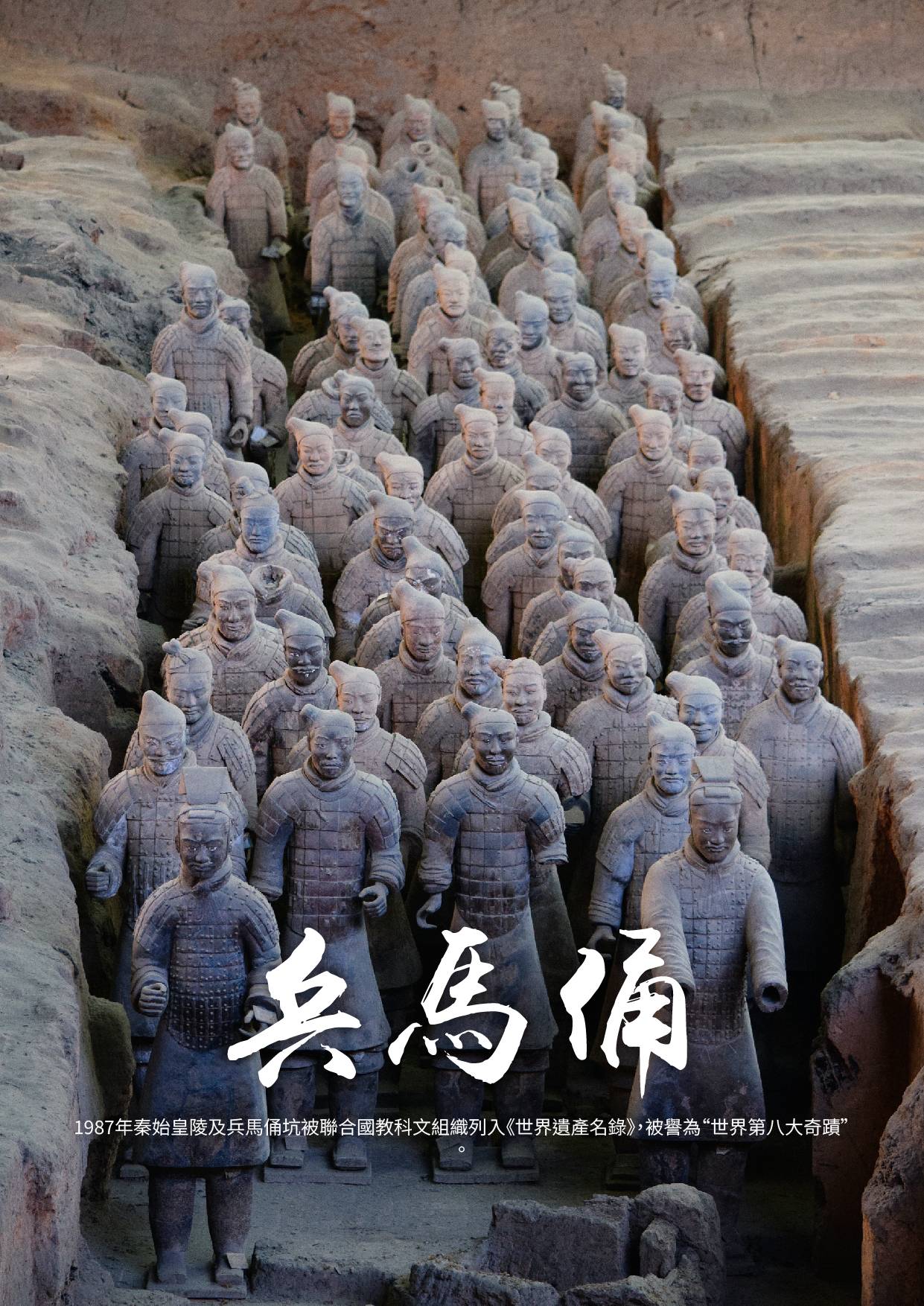 註:1987年12月,聯合國教科文組織已將秦始皇陵(包括兵馬俑坑)列入“世界文化遺產名錄”。它不僅是中國人民、也是全人類的一份珍貴文化財富。其中一、二、三號兵馬俑坑是秦始皇陵園內的一組陪葬坑,三個坑內共有陶俑、陶馬約8000件,像個龐大地下軍團,也是座古代雕塑藝術的寶庫。