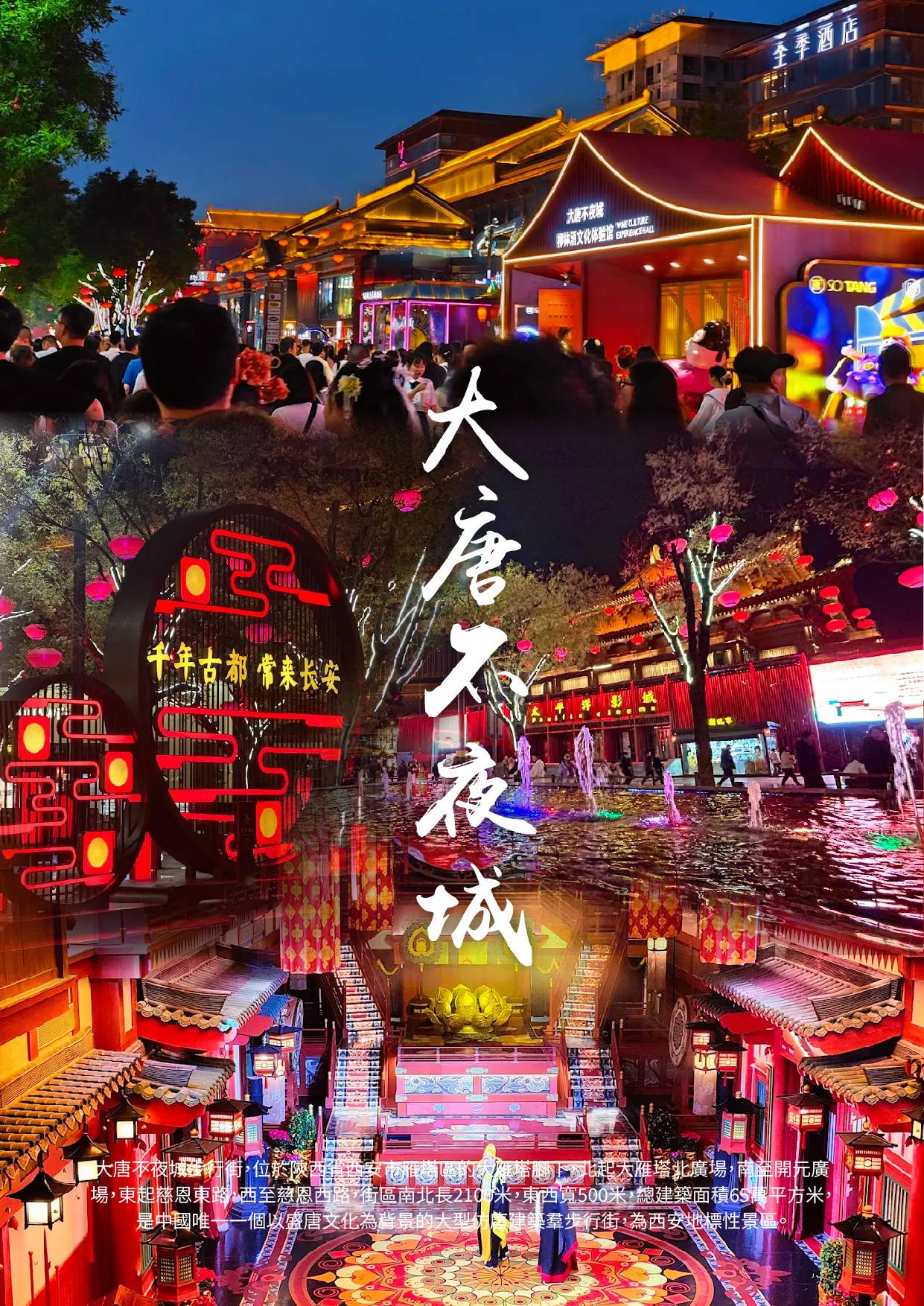 【大唐不夜城】大唐不夜城步行街,位於陝西省西安市雁塔區的大雁塔腳下,北起大雁塔北廣場,南至開元廣場,東起慈恩東路,西至慈恩西路,街區南北長2100米,東西寬500米,總建築面積65萬平方米,是中國唯一一個以盛唐文化為背景的大型仿唐建築羣步行街,為西安地標性景區。