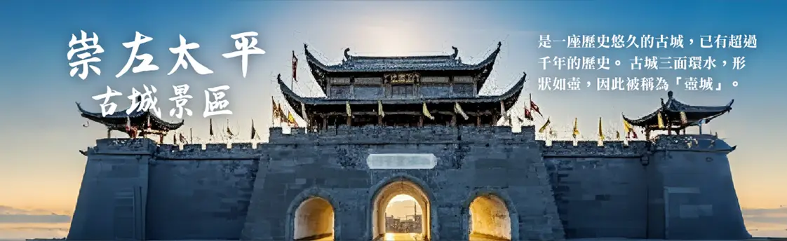 【崇左太平古城】位於江州區西南部,地跨左江南北岸。湘桂鐵路自東向西南穿過江南城區,左江從西南入境,往北而南迂環城中,再繞向東北面流去。古有「麗水四折,環其三面,其形若壺,故名壺城」之說。指三面被左江環繞,為一個右岸的牛軛狀河堤。這裡曾經是太平府故城的所在地。已經有一千多年的歷史了。在宋太宗年間,這裡曾經就是左江道太平寨,後來的元明清各朝都在這裡設立的府邸。太平古城它是一個綜合性的旅遊景區,景區裡面將太平古城明文化,還將現在的壯文化、糖文化、水文化四大文化融為一體一個整體,以廣西民居為特徵,重現太平古城壯觀的景象。