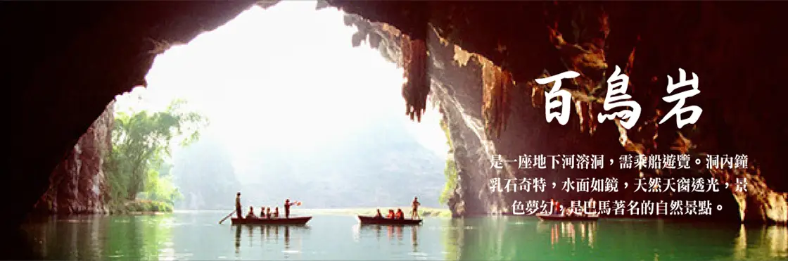 【延壽隧道(又稱水上蘆笛岩)百鳥岩】因每年春天有成群結伴的上百種鳥類在此集聚而得名~乘觀光船遊覽奇特的長壽生態地質自然景觀,地下泉水叮咚,洞中鐘乳石千姿百態,各肖物類,水碧石淨,光環影繞,特別是伴隨著遊船的前行,在每隔兩三百公尺就有一個天窗而形成日光月色的光感效果及在光與影不斷變幻的時光隧道中,猶如經歷了三天三夜的神奇感受而令人興奮不已。洞頂岩泉四季飄灑,洞中冬暖夏涼,三伏宜避暑,嚴冬可避寒。洞內距出口不遠的廳堂中隱約可聞百鳥輕唱,蝙蝠和鳴,廳頂有岩燕、岩鷹、翠鳥、蝙蝠等飛行動物在此棲息,每當朝霞初升或夕陽西斜的時候,成千上萬的岩燕飛出洞口貼水逐戲,,仿佛古人陶淵明筆下《世外桃源賦》裏「林盡水源,便得一山。山有小口,彷佛若有光,便舍船,從口入……」讓您仿佛如夢如幻般,令人感慨現代社會竟還有如此淨地。