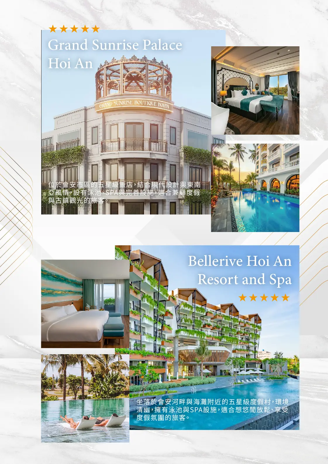- ★★★★★會安Grand Sunrise Palace 或 Bellerive Hotel 或 Little Oasis或同級