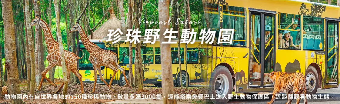 【Vinpearl Safari 珍珠野生動物園】這裡擁有世界上珍貴稀有動物數百種類:如孟加拉虎,犀牛,火鳥等,園區周圍還有數千種美麗的樹木與鮮花。內部有規模地區分為ZOO 動物園區、PRIMATE WORLD 靈長類動物園區及SAFARI 探索園區三大結構,特別安排搭乘SAFARI 遊園車,進入野生動物園區,體驗稀有的野生動物近在咫尺的感覺。在這裡可以看到一家之主獅王霸氣帶領母獅群、精瘦猛虎闊步巡視、河馬特有的慢節奏戲水、高人一等的長頸鹿優雅線條、成群斑馬身穿條紋制服悠閒進食,以及輕巧羚羊小跑步猶如跳家家酒等,絕對可以滿足您對動物園旅遊的期待。