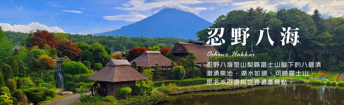 【忍野八海】是位於山梨縣忍野村的湧泉群,富士山融化的雪水經過80年的過濾而湧出的泉水。為國家指定天然記念物、名水百選、新富岳百景之一。西元800-802年間富士山發生延曆噴發,宇津湖分為山中湖與忍野湖。後來忍野湖干竭,變為盆地,但湧水口澤變為泉水,即今日的忍野八海。