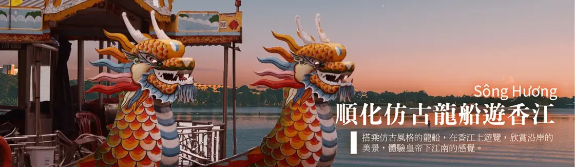 【仿古龍船遊香江】人們都說香江是順化的靈氣之源,水呈淡綠色而且又非常清澈,香江兩岸樹木蔥籠,據說是因為上游長滿繁密的石菖蒲,清澄的河水中,總是飄著淡淡的幽香,香江之所以得名。蜿蜒清澈穿過古城,將古城分成南北,也塑造出不少風景雅致的角落。江岸兩側全為綠草覆蓋,藍天、白雲、青山、綠水,人在此彷彿置身於畫中。香江景色之美,尤在黃昏入夜時,萬家燈火、滿天星斗一同慢慢點亮,映照在碧波之中,搭乘著仿古龍船,不時的古?鐘聲為伴,美的享受臻於佳境,曾吸引騷人墨客流連忘返,也不知使多少遊人為之陶醉和讚美。