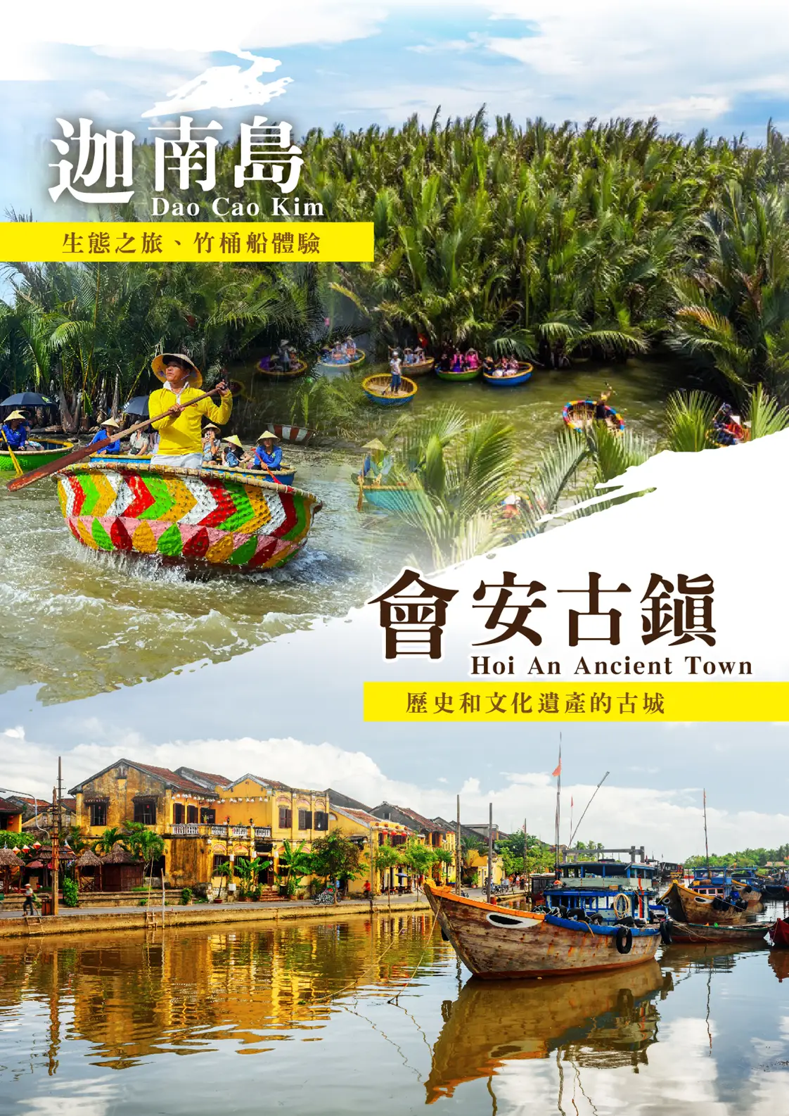 【迦南島】位於會安對岸,會安秋盆河一條發源於寮國與越南邊境地帶橫穿越南的河流,河邊水鄉景色美不勝收。秋盆河會安這側商鋪林立;對岸也就是迦南島還尚未開發,是一片相對原始的自然生態風光,岸上密布著水椰林、檳榔樹,島上居民大多以捕魚及木雕維生。