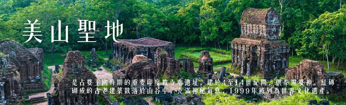 【美山聖地My Son Sanctury】為中越最著名的占婆遺址區世界遺產之一。西元200~1700年間統領越南中南部的「占婆王國」,於4世紀起開始建造,供奉占婆神靈及歷代國王,而占婆神靈中又以占婆王國的守護神濕婆神為主。1885年由一群法軍在叢林中發現掩蓋的占婆塔群,此地為越南一個時代文化交融的例證,它借鑒了南亞次大陸的印度教建築風格,曾為占婆王國的政治和宗教首都。雖然越戰期間越共將此據為反攻基地,因此遭受美軍炮火的轟炸,許多遺跡已被破壞,不過遺跡群面積相當大,目前遺留約25座建築,遺跡群內可看到壯觀的塔寺、以磚為主要建材,飾以砂岩雕飾,各種人獸石雕活靈活現,可見當時的石雕藝術以相當良好,所以美山勝地仍是這區域保留最完整的占婆遺跡,1999年已列為世界文化遺產,整個占婆建築有著獨特的細緻美感,初到此地有種在越南驚見吳哥窟的感覺。
