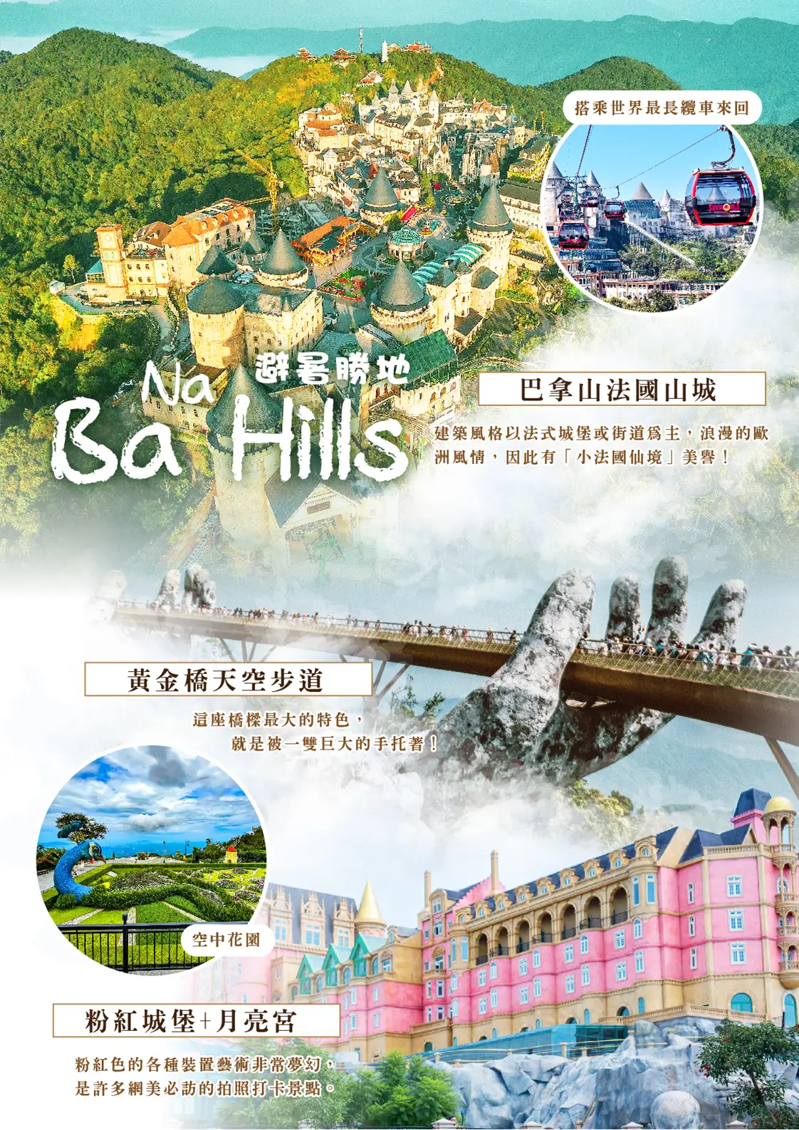 【法國山城Ba Na Hills】位於峴港市約45公里處,地勢優美,在此搭乘纜車,纜車長16545呎,20分鐘直達海拔4239呎的山上。纜車剛開始攀升,腳下盡是樹林石澗,10分鐘後以身處於雲海當中,眼前景像猶如身處仙境之中。法國人曾在此建立避暑區,氣候一日四季:早晨春季、中午夏季、下午秋季、夜晚冬季。婆納有遼闊的自然林,溪泉縱橫其間,天氣晴朗時,站在主山頂,可以看見峴港市、容橘灣、美溪海等整個寬廣空間,猶如一幅巨型山水畫。婆納-主山區已成為著名旅遊區。旅館、別墅以及其他服務如餐廳、網球場等等配套齊全。遊客上山坐吊纜車抵達山頂,婆納之美在於仰天看不到太陽,晚上看不到星星;『靈應寺』建於頂峰雄偉,體會靈性之旅,山頂享受渡假休閒之美。