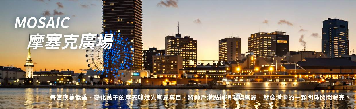 【摩塞克購物中心】神戶港的摩賽克廣場可說是神戶的台場,是位置絕佳的戶外購物商場,您可以從開闊的神戶港眺望海景,裏頭也彙集了多家神戶的伴手禮、時尚服飾、美食店家、雜貨小物和娛樂消遣等90多家商店。