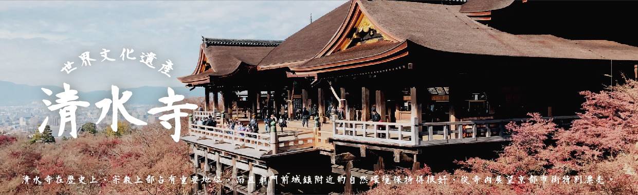【世界文化遺產:清水寺】清水寺起源於八世紀末期。現在的建築物是1633年的再建,正殿是國寶,主佛是一面觀音菩薩的木像。清水寺在歷史上,宗教上都占有重要地位,而且廟門前城鎮附近的自然環境保持得很好,從寺內展望京都市街特別漂亮。