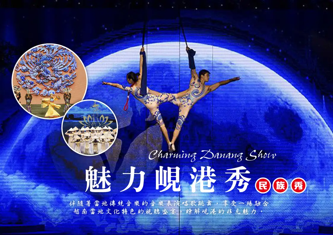 【魅力峴港民族歌舞秀】峴港最具代表的大型民族風情歌舞秀,深度挖掘峴港旅遊文化,並斥鉅資邀請眾多著名舞蹈藝術家參與編排製作,經由不同舞蹈形式充分展現越南人文風俗民情、歌唱傳頌越南人民的勤勞善良,展現友好與和諧。