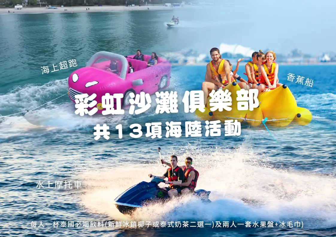 【彩虹沙灘俱樂部】擁有約 2,000 公尺細沙海岸線,四面環海,是芭達雅人氣最旺的海灘區。現場提供多種水上與沙灘活動,包括海上超跑、水上摩托車、香蕉船、水上滑板、獨木舟、SUP 立槳等,也設有沙灘躺椅與戲水設施。旅客還能享用當季水果、冰涼毛巾及冰鎮椰子或泰式奶茶(二選一),在盡情玩水的同時,也能悠閒享受海灘風光。