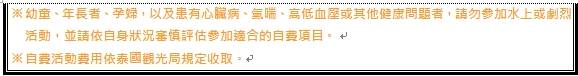 3. 行程景點、水上活動、食宿均包含於行程費用中,不參加者視為自動棄權,無法退費或轉讓他人使用,本產品報價中所含景點門票等按旅行社扣價核算,旅客不再享受其他折扣與優惠,亦不另行退還差價。安全措施及操作程序由領隊及導遊在外站詳細告知,請旅客務必遵守。為安全起見,行程若有包含按摩或SPA,16歲以下旅客恕不包含,不可轉讓或退費。嬰兒之行程餐食且不佔機(車)位;行程中景點、秀場(除有年齡限制外)可入場但不佔座位,提醒旅客須自行備妥嬰兒餐食。