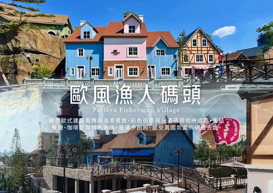 【歐風漁人碼頭】全新開幕的歐風漁人碼頭,如同童話般的彩色港灣沿海岸延伸,街景充滿歐式風情。遊客可漫步拍照、悠閒放空,隨手取景皆是雜誌感畫面。園區內還設有仿造紐約華爾街的金牛地標,成為熱門打卡景點,呈現出芭達雅除陽光沙灘外的新興旅遊風貌。